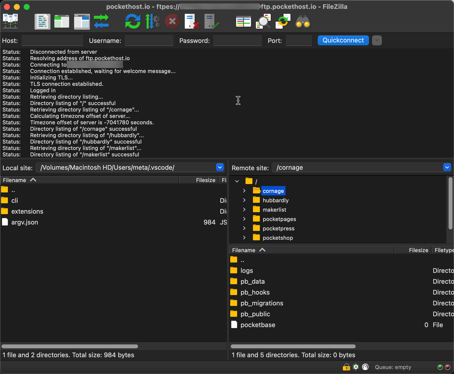 Use the FTP address provided via ftp.pockethost.io. You log in with your pockethost.io username and password.