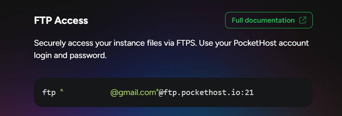 PocketHost provides Secure FTP (FTPS) access to all your PocketBase files.