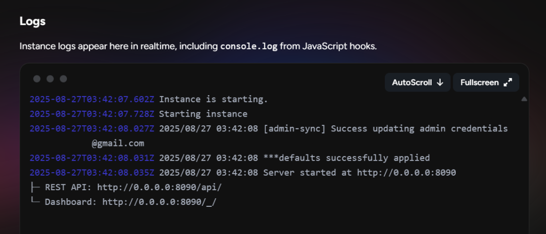 You can view live logs while your PocketHost instance is running. console.log output from pb_hooks scripts will also appear in these logs.