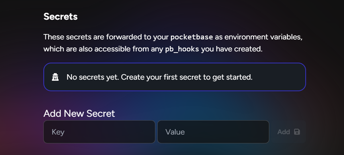 Secrets are created through the PocketHost instance dashboard and are automatically made available in the PocketBase runtime environment, including pb_hooks. Use secrets to securely store API keys and other sensitive information that should not be embedded in your source code.