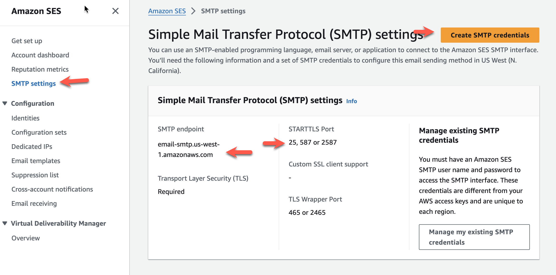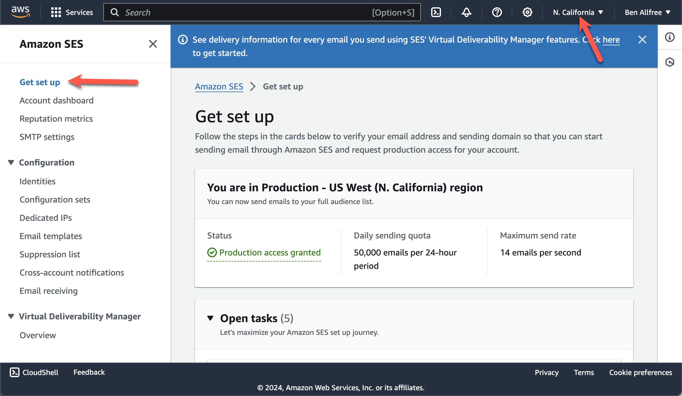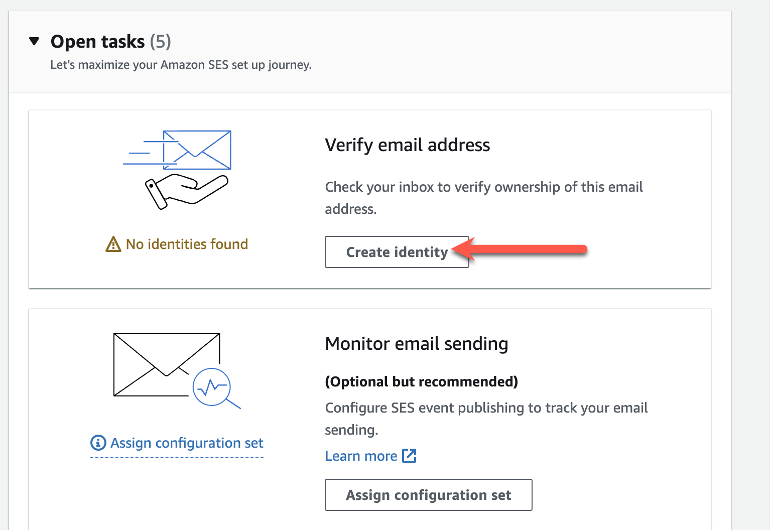 Log in to your Amazon SES account and follow their getting started guide to create a FROM address and sending domain. Make sure you’re in the region you prefer. This is important if you have existing domains because AWS frowns upon approving multiple sending regions.