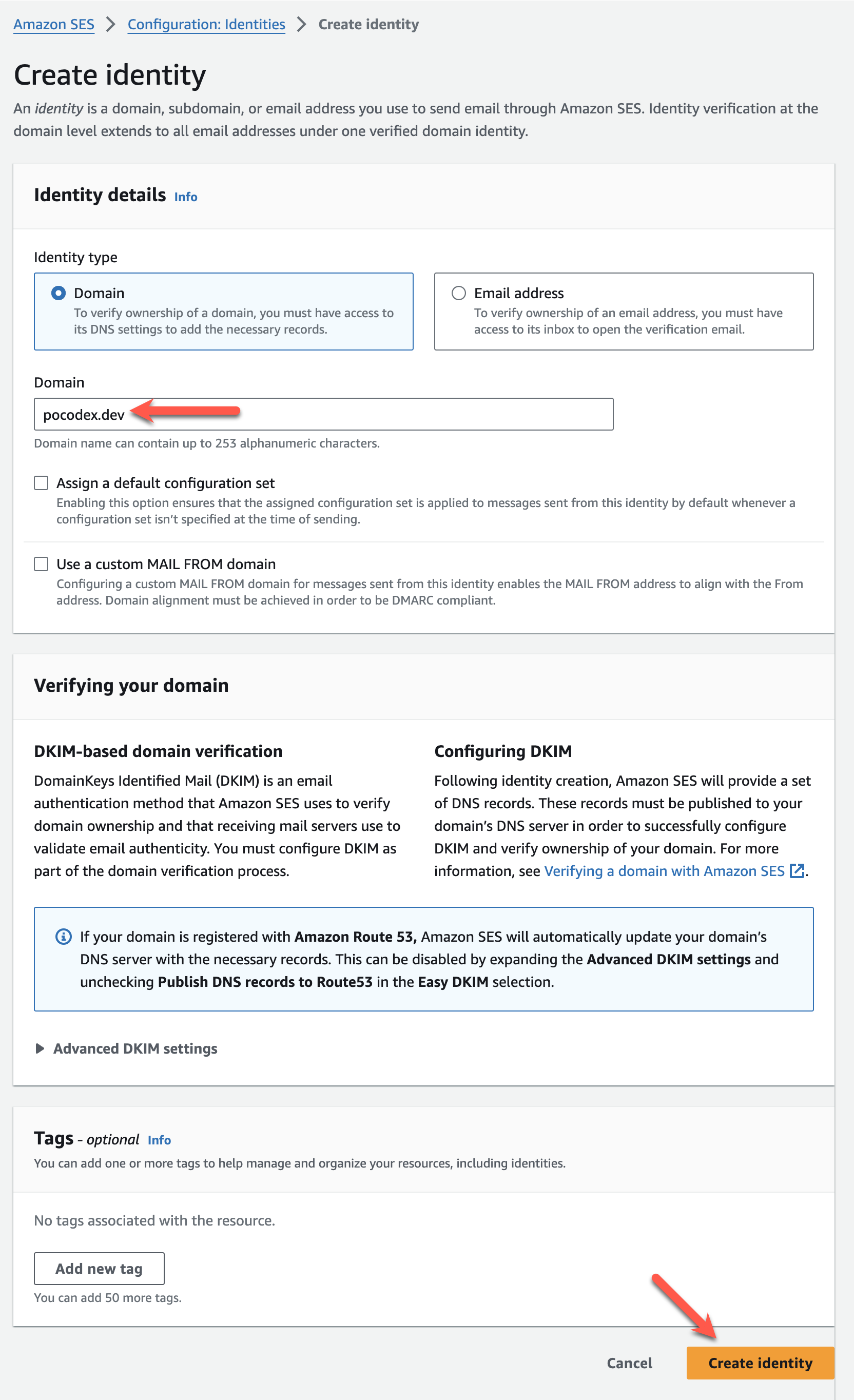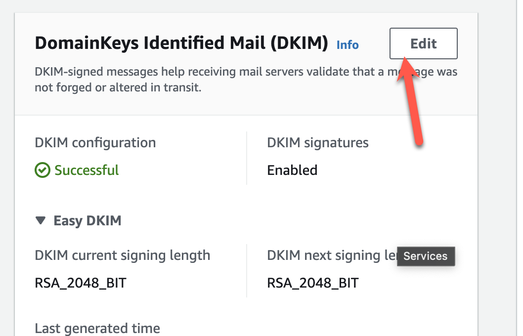 If verification takes too long, go to Identities > DKIM, click Edit, then Save to trigger an immediate re-verification.