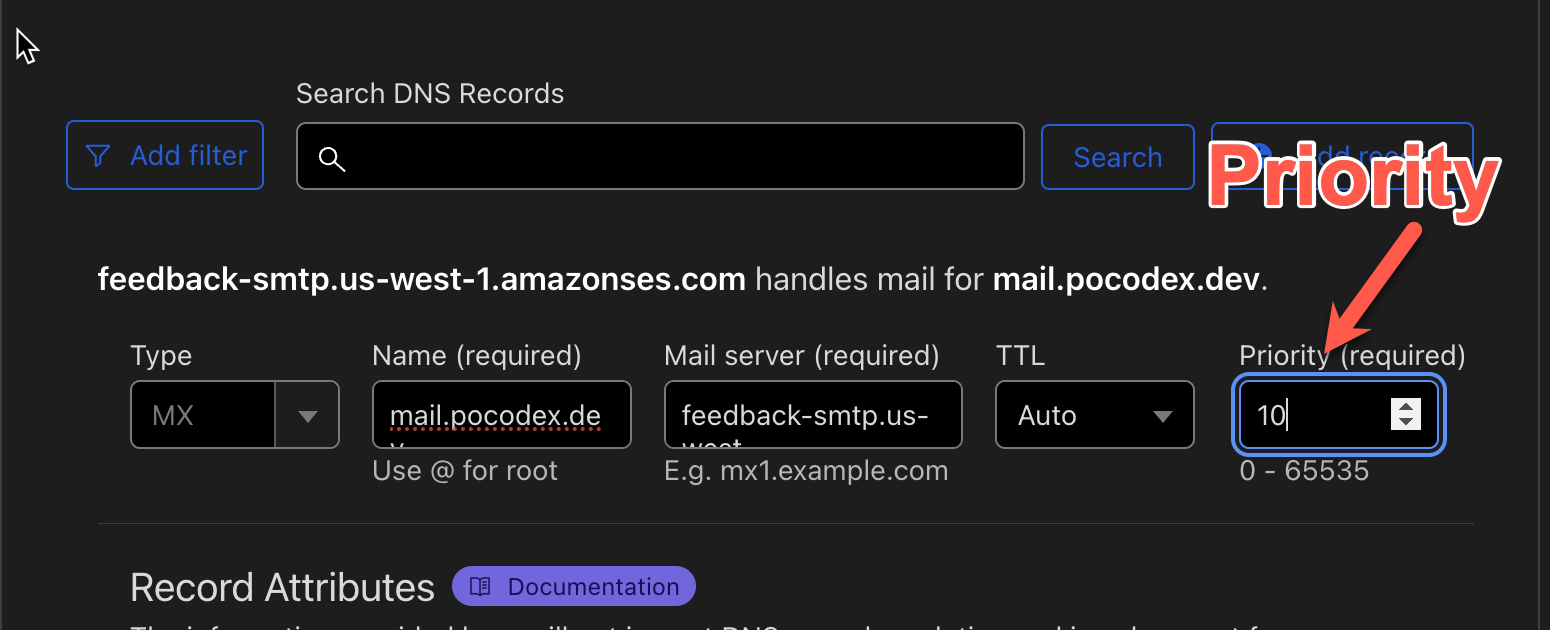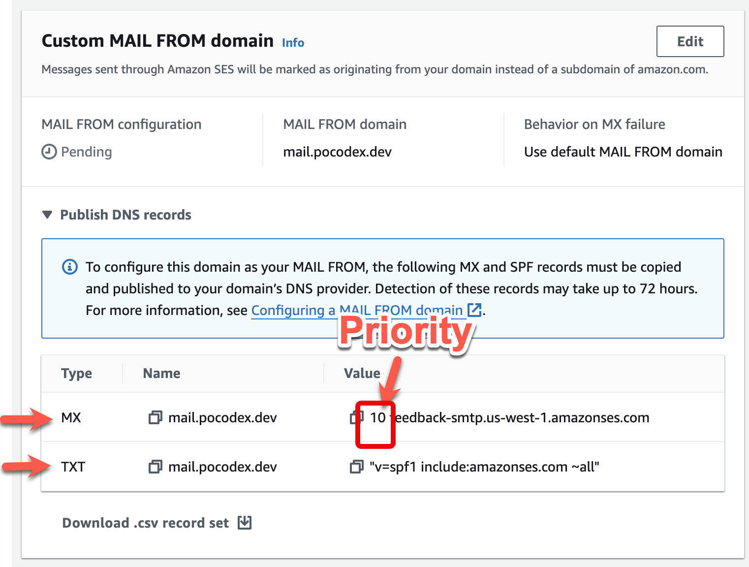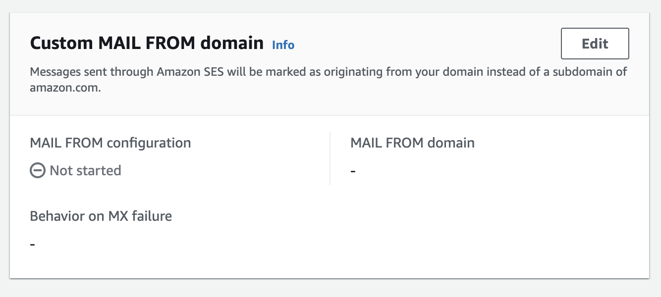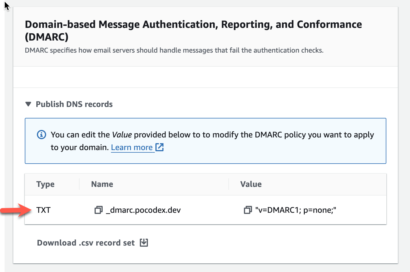 You’ll need to add DNS records provided by SES to your DNS provider. Unlike Google Suite, you’ll need to enter these values manually. They do not provide integrations with any DNS providers.