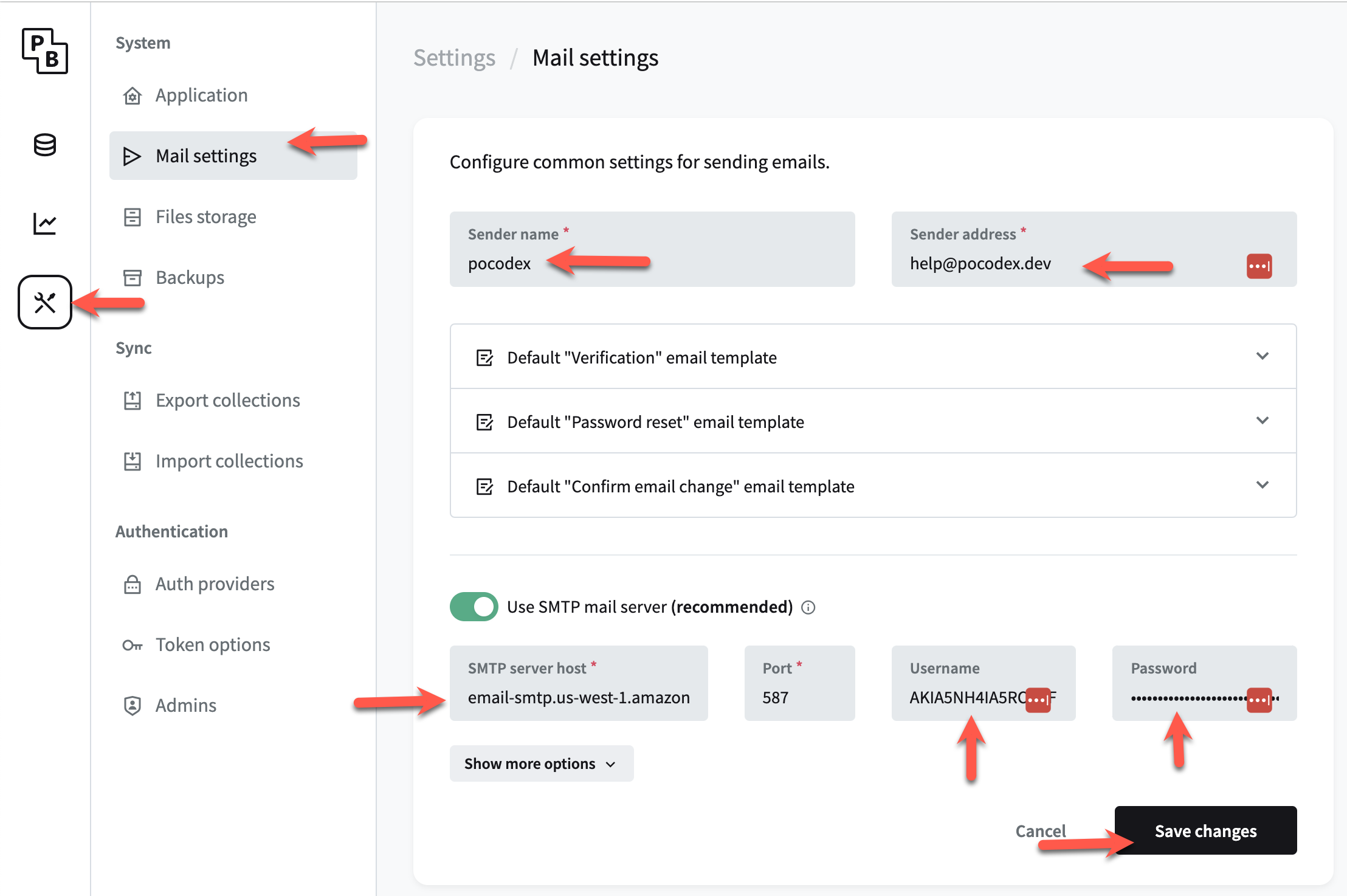 Enter the SMTP credentials in PocketBase’s admin panel, and ensure the SENDER address is correctly set. If SES hasn’t verified your email yet, you can test it by sending an email to test@<yourdomain>, which should go through if the domain is the same.