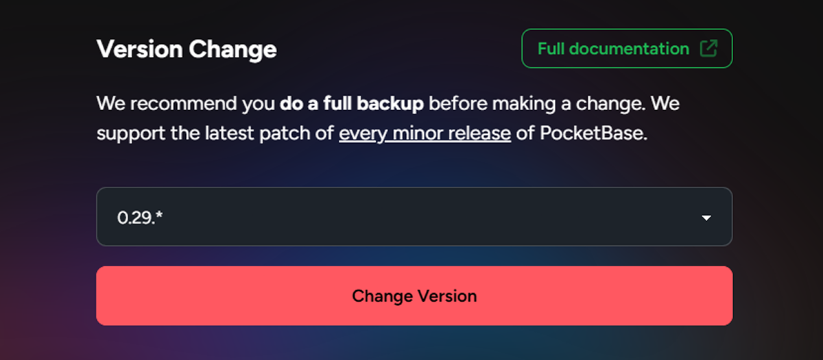 PocketHost supports the latest minor release of each PocketBase version (e.g., 0.16.*), and you can update your instance to stay on the latest release. When changing PocketBase versions, whether upgrading or downgrading, it’s important to take precautions to ensure the stability of your instance and the integrity of your data.